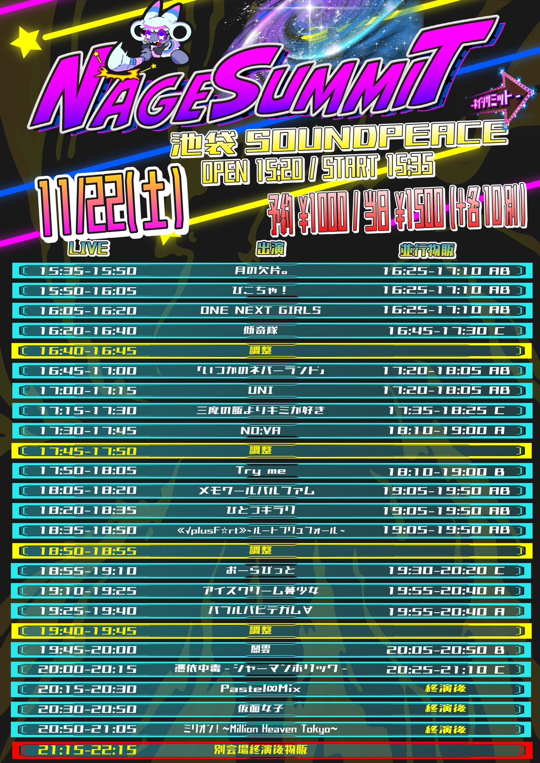 予約 ¥1000 / 当日 ¥1500 / 各D代別