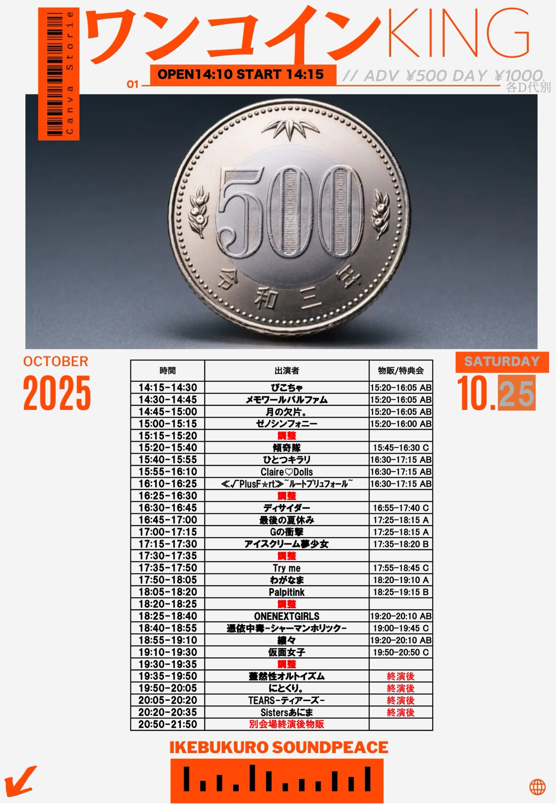 予約 ¥500 / 当日 ¥1000 / 各D代別