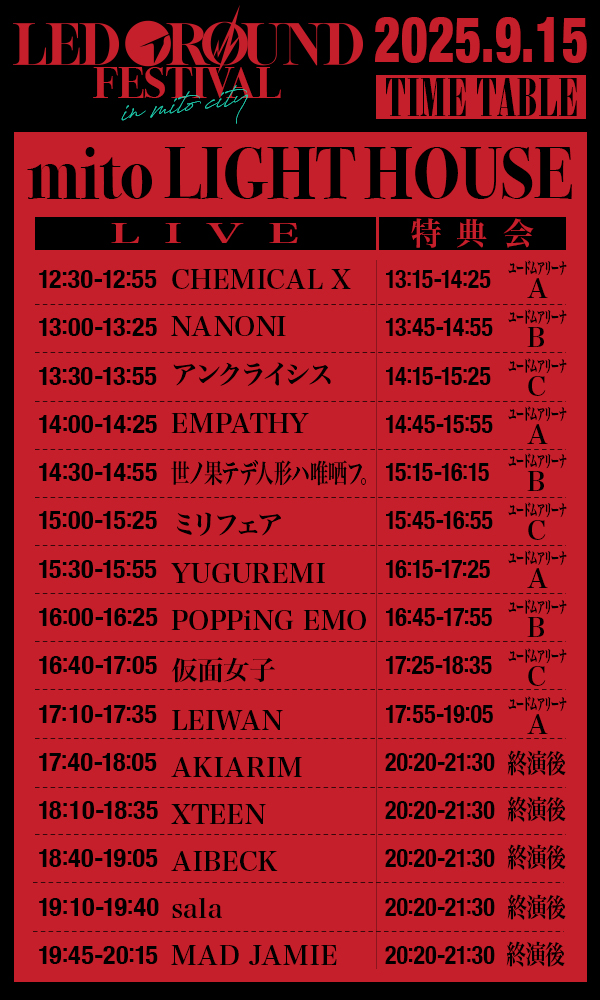 MAD JAMIE / sala / AIBECK / LEIWAN / XTEEN / AKIARIM / POPPiNG EMO / NANONI / Finally / ENVY PARANOID / キミイロプロジェクト / Caress Van End / CHEMICAL X / アルカ / 仮面女子 and more...