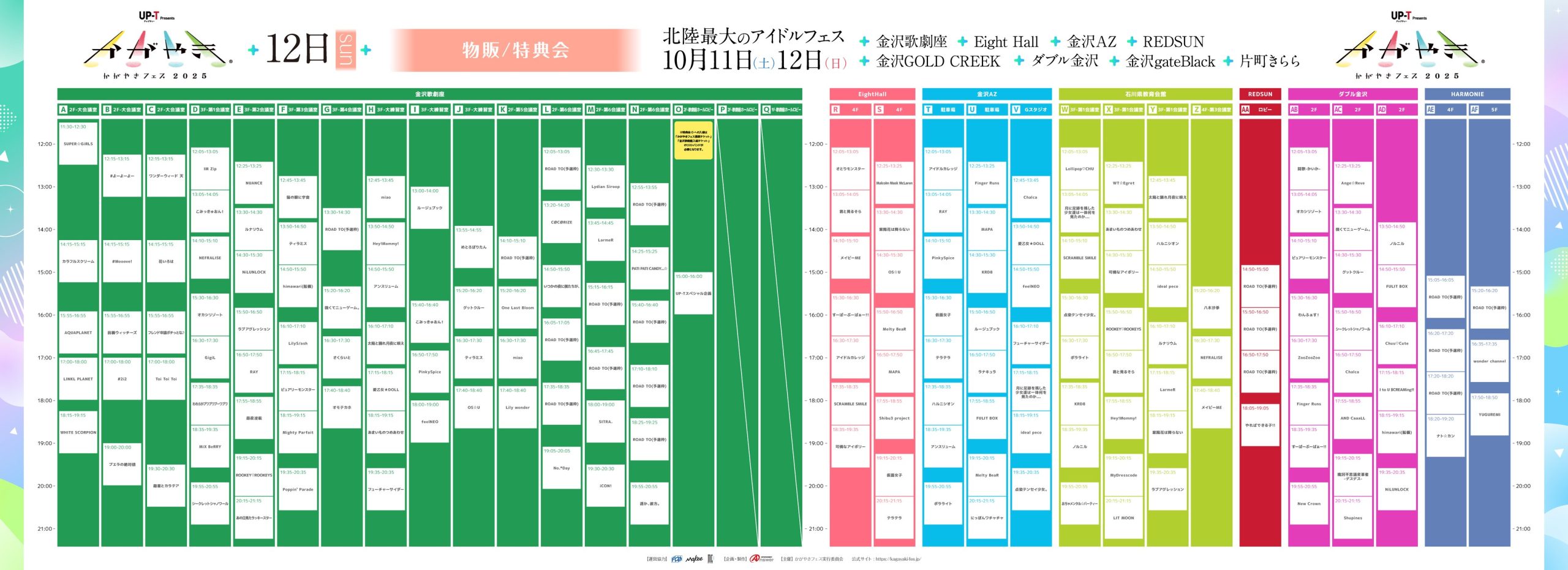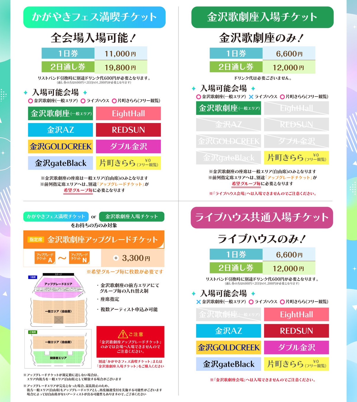 \ 特典会【O/P/Q】会場のみ 金沢歌劇座のホールエリア内となりますので、特典会へのご入場には「かがやきフェス満喫チケット」または「金沢歌劇座入場チケット」のリストバンド提示が必要となります。 その他の特典会会場は「ライブハウス入場チケット」でもご利用いただけます。